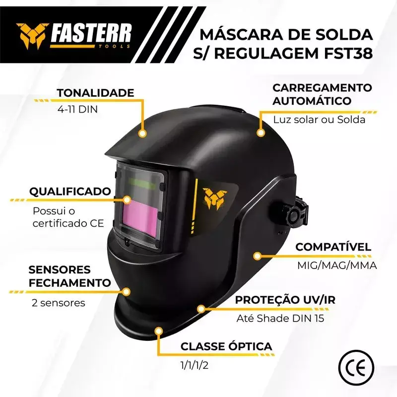 A Máscara de Solda com Escurecimento Automático Fasterr Tools FST038 é a solução ideal para quem busca segurança, tecnologia e praticidade em processos de soldagem. Desenvolvida com sensores inteligentes, ela garante proteção imediata aos olhos do operador, com ajuste automático da tonalidade durante a solda, proporcionando mais eficiência e conforto mesmo em longas jornadas de trabalho.